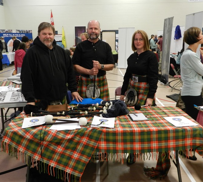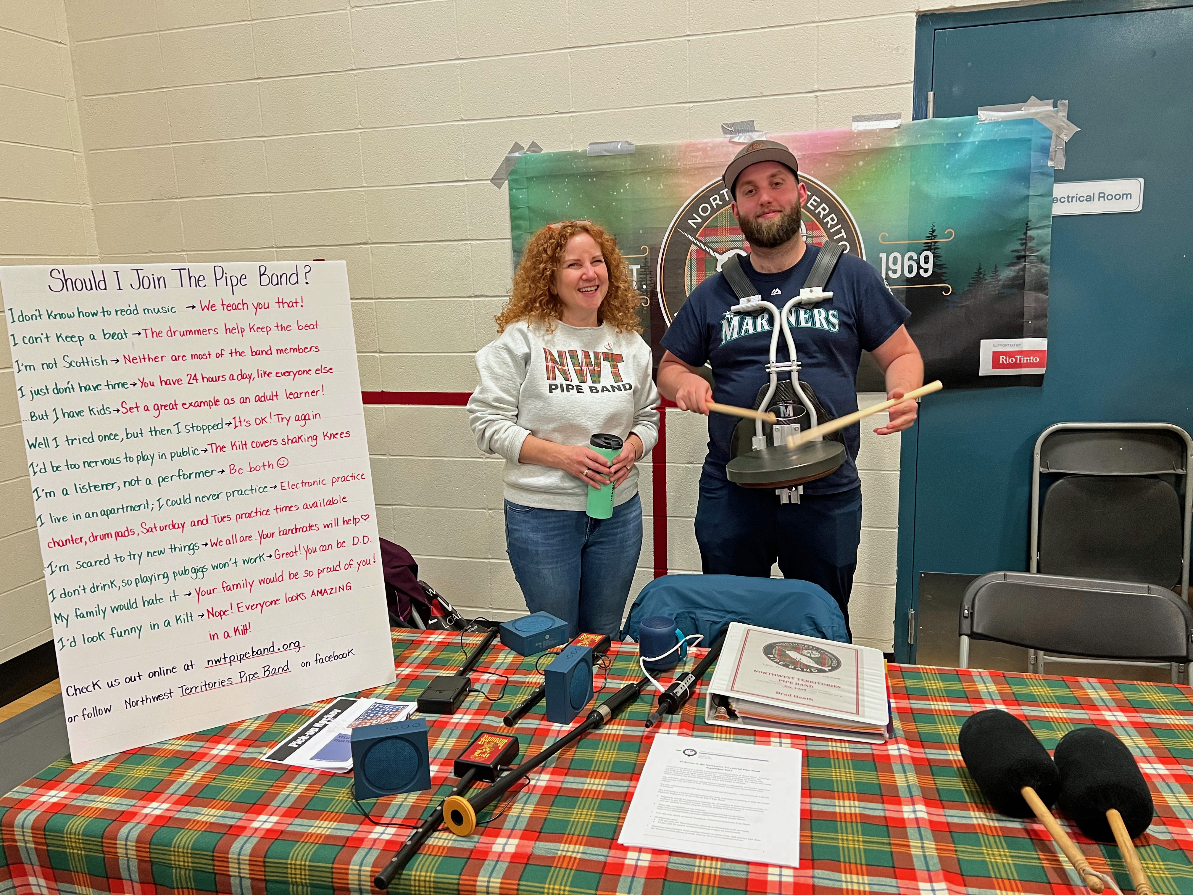 Thanks to everyone who stopped by our table this evening at the Yellowknife Community Showcase on September 14, 2022 at the Multiplex. Pipe Major Lori Clark and side drummer Chris Moore are shown here waiting for more people to stop by and talk with us. Also helping out at our table last night were Drum Major Kelly Fischer, side drummer Jennifer Zhu and piper Brad Heath. Piping lessons will start in a couple of weeks - so there's still time to contact us if you're interested in learning to play the Great Highland Bagpipes. You can contact us by email (go to the Contact page) or visit us on our Facebook page (search Northwest Territories Pipe Band). Our group lessons for beginners are tentatively scheduled to start on Tuesday, September 27, 2022 from 7:00 - 7:30 p.m.